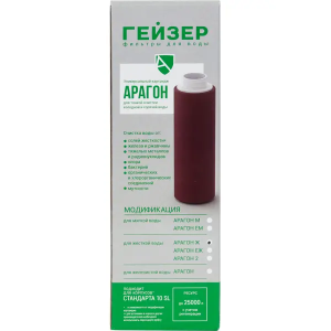 Картридж Гейзер Арагон Ж предназначен для жесткой воды (средний уровень минерализации). Обладает тремя уровнями фильтрации (механической, ионообменной и сорбционной). Возможность регенерации фильтрующего элемента в домашних условиях. Подходит для холодной и горячей воды.