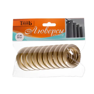 Комплект матовых золотистых люверсов для пошива штор со складками, подходит для круглых карнизов, аналогичной отделки или контрастных. Люверсы изготовлены из пластика, не окисляются, их можно не снимать со штор во время стирки. Также пластиковые крепления позволяют открывать и закрывать шторы без лишнего шума, не царапая карниз. Простая установка люверсов на ткань, не требующая особых приспособлений, позволит сэкономить на обращении в ателье и реализовать свои творческие замыслы. Специальная клеевая люверсная лента, которую также можно купить в магазине , поможет изготовить шторы как из плотных тканей, так и из тонких, и даже прозрачных.