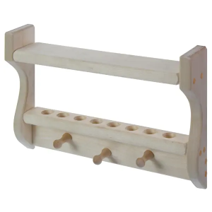 Полка с подставкой для масел с тремя крючками позволяет хранить флаконы с аромамаслами в ванной, бане или сауне, не опасаясь, что маленькие баночки потеряются или разобьются. Материал изготовления — натуральная древесина. Полка имеет 8 углублений для флаконов. У вас будет возможность использовать разные масла во время банных процедур, а также комбинировать их.
