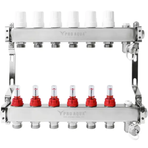 - Поставляется в сборе. Подающий (снизу) (1шт.) и обратный (сверху) (1шт.) коллекторы; Термостатические клапаны с колпачками ручной регулировки (6 шт.); Регулировочные клапаны с расходомерами (6шт.); Дренажные краны (2шт.); Ручные воздухоотводчики (клапан Маевского) (2шт.); Заглушки (2шт.); Настенные кронштейны с разнесенными осями (2 шт.)