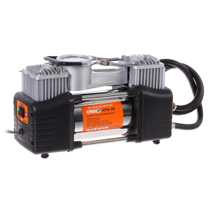 Компрессор поршневой автомобильный «Спец КПА-90» предназначен для автоматического накачивания шин воздухом, подаваемым под давлением. Модель имеет высокую производительность — 85 л/мин, но при этом отличается компактными габаритами. Ее удобно хранить в багажнике автомобиля. Двухцилиндровый компрессор подключается к аккумулятору при помощи зажимов-«крокодилов», которые входят в комплект вместе с насадками под разные типы шин. Устройство снабжено манометром с хорошо читаемой шкалой и удобной транспортировочной ручкой.