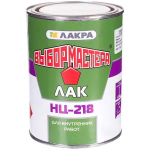Лак НЦ-218 «Выбор мастера» от отечественного бренда «Лакра» является классическим образцом нитроцеллюлозных лакокрасочных материалов. Здесь вы можете купить его в жестяной банке весом 0,7 кг нетто. При расходе 80–120 г/м2 на один слой легко определить, что предлагаемой упаковки хватит на 6–9 м2 поверхности. Однако следует учесть, что для качественной отделки чаще всего требуется многослойное нанесение лака. Благодаря нитроцеллюлозной основе лака покрытия быстро сохнут, но при работе с ним и в процессе сушки ощущается сильный запах, поэтому помещения нуждаются в регулярном проветривании.