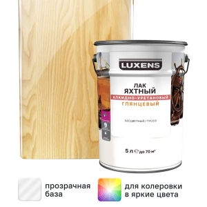 Лак яхтный Luxens 5 л глянцевый предназначен для защиты и декоративной отделки деревянных и металлических поверхностей (наводных частей речных и морских судов различных типов, пристаней, причалов, а также фасадов домов, оконных рам, заборов, садовой мебели), эксплуатируемых в условиях интенсивного атмосферного воздействия (атмосферных осадков, солнечного излучения, перепадов температур) и внутри помещений. Наносить лак следует кистью, валиком или краскораспылителем. Рекомендуется двухслойное нанесение лака. Каждый последующий слой наносить после полного высыхания предыдущего. Колеруется универсальными колеровочными пастами автоматической или ручной колеровкой. Время высыхания каждого слоя- не более 6 часов. Начало эксплуатации в щадящем режиме через 24 часа. Полная физическая и химическая прочность покрытия достигается через 7 суток. Расход при нанесении в один слой до 70 кв.м
