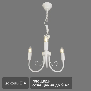 Люстра крепится к потолку с помощью крюка, рожки светильника смотрят вверх. Для оптимального размещения в интерьере комнаты можно отрегулировать высоту светильника от 52 до 102 см, чтобы адаптировать его под высоту потолка. При снижении конструкции световой поток акцентируется в определенной зоне, при поднятии — мягко рассеивается. Для работы требуются 3 лампы с мощностью 60 Вт. Материалом основания служит металл. Комплектация люстры не включает в себя лампочки, их можно купить в нашем интернет-магазине отдельно. Дополнить светильник можно фирменным бра из той же серии. Тип цоколя лампы: E14.