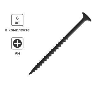 Саморез изготовлен из стали с защитным фосфатным покрытием. Потайная головка со шлицем стандарта Phillips (размер PH2) позволяет полностью утопить крепеж в материал и зашпатлевать шляпку, сделав место соединения незаметным. Диаметр самореза — 4,2 мм, длина — 70 мм. Крепеж продается наборами по 6 шт.