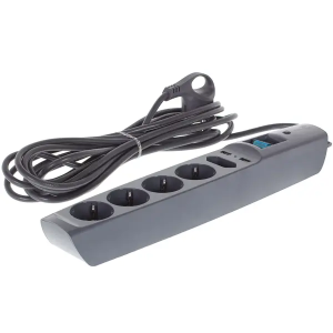 Материал корпуса сетевого фильтра — долговечный поликарбонат. Сохранит первоначальный вид спустя годы использования. Оборудован кабелем подключения длиной 5 м и сечением 0,75 мм. Черный цвет удачно впишется в любой интерьер.