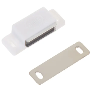 Магнитная накладная защелка производства испанской компании AMIG используется в качестве замка для мебели. Для небольших шкафчиков или секретеров она может служить основным замком, в платяных шкафах с высокими дверцами одну или две защелки дополнительно к основному замку устанавливают для того, чтобы дверцы закрывались плотнее и со временем не деформировались. С той же целью защелками оборудуют межкомнатные и балконные двери. Изделие состоит из магнита, заключенного в прочный белый пластиковый корпус, и ответной металлической части. В комплект также включены саморезы, с помощью которых крепятся половинки защелки. Размер защелки 43х14.5х12 мм.